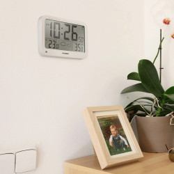 Prístroj naviac disponuje funkciou budíka. Je možné nastaviť až štyri nezávislé časy budenia. Pri každom z nich určite oceníte obľúbenú funkciu SNOOZE. Takto veľká a elegantná meteostanica si postačí s napájaním pomocou dvoch ceruzkových batérií. V prípade inštalácie na stenu sa tak nemusíte obávať problému s nevzhľadnou kabelážou vedúcou k meteostanici.