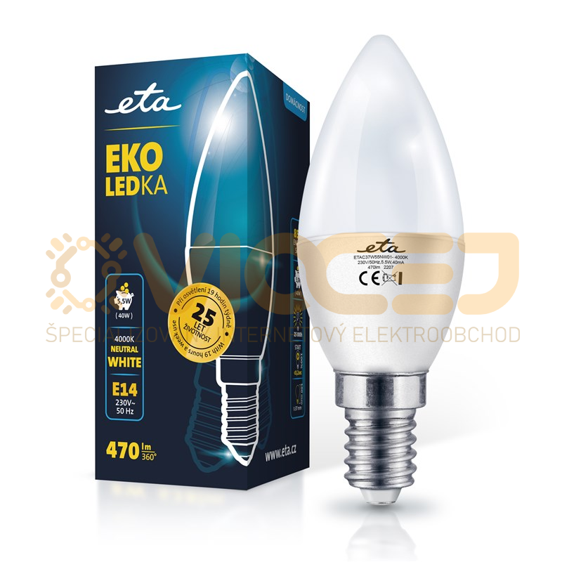 EKO LEDka s päticou E14 a vstupným napätím 230 V je alternatívou klasickej 40W žiarovky. Svetelný tok žiarovky je 470 lm s uhlom svietivosti 360 °. Farebne táto žiarovka vyžaruje neutrálne biele svetlo (4000 K).
