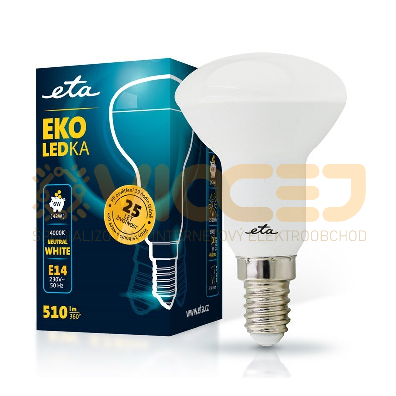 EKO LEDka s päticou E14 a vstupným napätím 230 V je alternatívou klasickej 42W žiarovky. Svetelný tok žiarovky je 510 lm s uhlom svietivosti 360 °. Farebne táto žiarovka vyžaruje neutrálne biele svetlo (4000 K).
