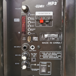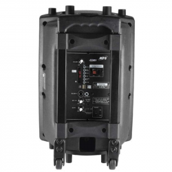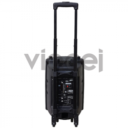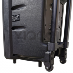 Malý prenosný reprobox vhodný na menšie exteriérové a interiérové podujatia vhodný tak na hovorené slovo ako aj spev. Súčasťou balenia tohto reproboxu je bezdrôtový mikrofón s možnosťou regulácie hlastiosti. Pokiaľ vám však nebude postačovať jeden mikrofón určite oceníte mikrofónový vstup Jack 6,3 so spoločnou regulácoiu hlasitosti. Taktiež tento reprobox podporuje prehrávanie rádia FM a priímanie hudby prostredníctvom Bluetooth. Prevádzka na vstavaný akumulátor je 9 - 10 hodín a v prípade potreby je možné použiť pripojenie z externej 12V batérie (napr.auto-akumulátor) alebo jednoducho systém pripojte na sieť 230V prostredníctvom priloženého adaptéra 9VDC. Použitie reproduktora je samozrejme možné aj počas nabíjania akumulátora. Jednoduchú prepravu boxu Vám uľahčí pár koliesok na spodnej časti reproboxu a teleskopické madlo nastaviteľné v troch polohách (zasunuté - stredná výška - maximálna výška).