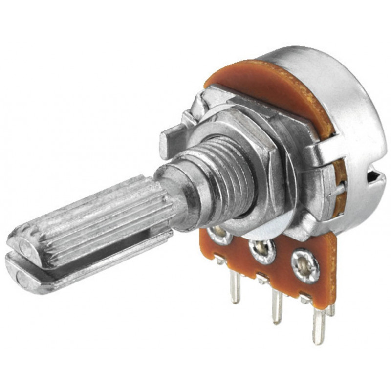Potentiometers, monoWith slotted 6 mm shaft, for 18-tooth push-on buttons, with nut fixing and PCB solder connections.
