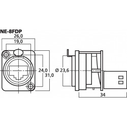 EtherCon feed-through panel jacks, for industrial use and Ethernet cabling on stage.RJ45 jack with strain reliefRJ45 jack in patch versionD series standardCorresponds to the requirements of Cat. 5 according to TIA/EIA and ISO/IEC NE-8FDP = nickel-platedNE-8FDPB = black