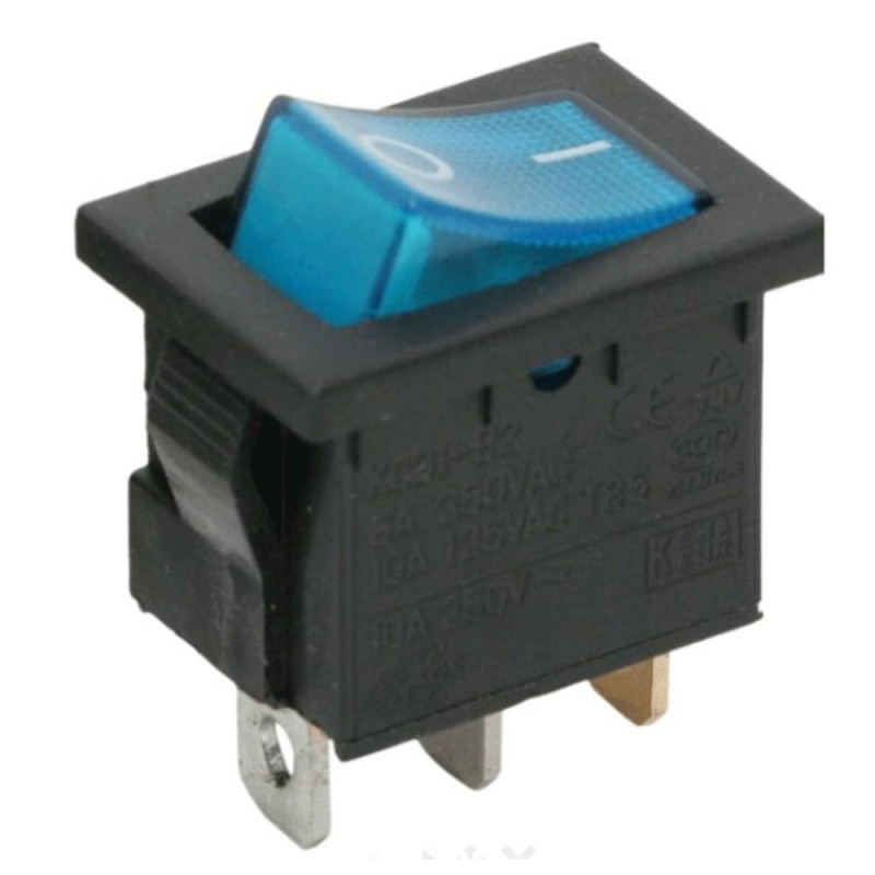 Kolískový vypínač; Vypínací kontakt s aretáciou (2polohy) 2pin(+1pin LIGHT); 6.5A/250VAC; S podsvietením 230V; Do panelu; Montáž 19.2x13mm