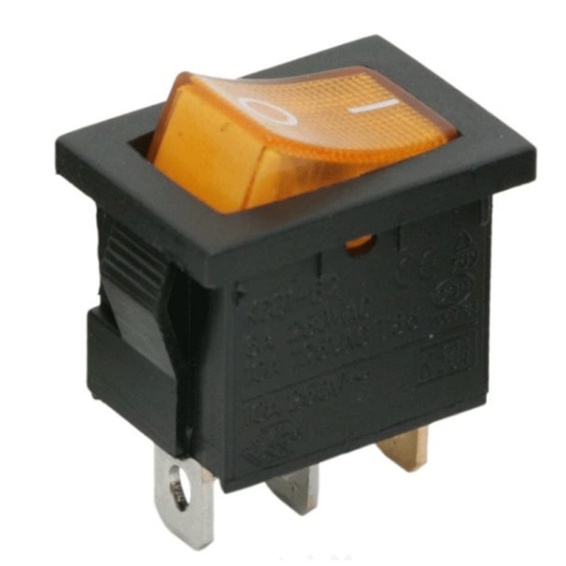 Kolískový vypínač; Vypínací kontakt s aretáciou (2polohy) 2pin(+1pin LIGHT); 6.5A/250VAC; S podsvietením 230V; Do panelu; Montáž 19.2x13mm