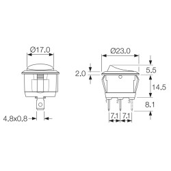 Kolískový vypínač; Vypínací kontakt s aretáciou (2polohy) 2pin; 6A/250VAC; Do panelu; Montáž Ø20.2mm