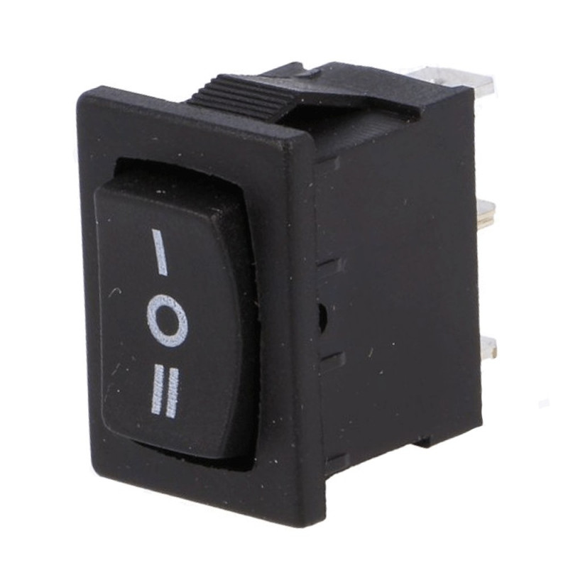 Kolískový prepínač; Prepínací kontakt bez aretácie (1poloha) 3pin; 6A/250VAC; Do panelu; Montáž 19.2x13mm
